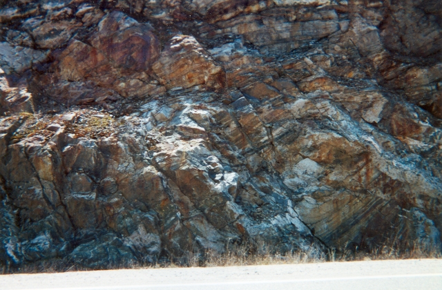 Photo 6. - Le mélange granite et skarn tourne au gneiss rubané. Photo 29 avril 2000.